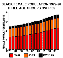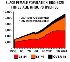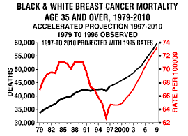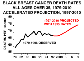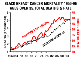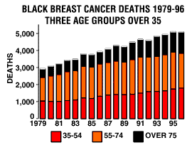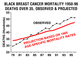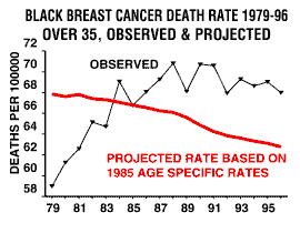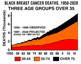 1950-2020 Figure 10 In Figure 10 the rate displays the same upward surge in the 1980s that we have associated with the Chernobyl insult, but Black women do not show any improvement in the period after 1990 when for White women the effects of Chernobyl appeared to be dissipating. This suggests that the immune response is inferior in Black women as compared to Whites, undoubtedly because of poverty and poorer nutrition. This shows up especially in Figure 11, which shows how much higher were the post-1985 observed numbers of deaths than the numbers projected if the age-specific mortality rates of each age group remained at the pre-Chernobyl level of 1985. Figure 11  Figure 12 compares the observed overall annual mortality rates for all Black women over 35 in recent years over what these rates would have been had the 1985 age-specific rate remained unchanged from the pre-Chernobyl level of 1985. Clearly the post-1985 insult to the immune response of Black women was so great that even by 1996, the observed rate was about 68 deaths per 100,000 women as against a projected level of 63 deaths, had the 1985 rates been maintained. Figure 12  Figure 12 also shows that with a constant set of age-specific rates, there would have been for Black women as for White women, a steady decline since 1980 in the overall mortality rates over age 35. Again as with White women, a rapid increase of Black female baby boomers who reached the age of 35 in 1980, meant that those dying of breast cancer with relatively lower age-specific mortality rates than older women--would lower the overall rate. Figure 13 reveals how much more rapid was the rise in the number of younger Black women aged 35 to 54 in this period than the increase in older women. By 1996, younger women made up more than half of the women old enough to die prematurely of breast cancer. Figure 13  Figure 14 records a steady annual increase in the number of breast cancer deaths among younger Black women since 1980, far greater than for White women as shown in Figure 6. This explains why, with increasing numbers of deaths of younger women, the overall mortality rate of all women over 35 should tend to fall. Figure 14  Figure 15 offers a projection, provided by the Census Bureau, of the expected age composition of Black women over 35 for the years 1990 to 2020. This shows clearly that the 1980s and the 1990s were the years in which the steady increase of baby boomers swelled the ranks of younger women aged 35 to 54, but that in the first two decades of the 21 century, baby boomers will accelerate the increase in the number of older women over the age of 55. Figure 15  In this later period there will no longer be a decline in the overall mortality rate due to the increasing importance of young women under 55. In fact Figure 15 shows that there will be no increase in the number of Black younger women aged 35 to 54 in the first two decades of the 21st century. For both White and Black women we can expect that in the first two decades of the 21st century baby boomers will constitute the bulk of older women over the age of 55, the peak years of breast cancer mortality, and that on this score alone there will be a rapid increase in the number of women dying of breast cancer. As we did in the case of White women, we shall now project the number of future Black female breast cancer deaths based on holding constant the 1995 age-specific rates for each age group. See figure 16. With this assumption of unchanging future mortality rates, Black female breast cancer deaths among women over 35--which numbered 1225 in 1950--would increase seven-fold to 8576 by 2020. This is twice the increase we found for White women in Figure 8. Figure 16  This illustrates that a relatively greater impairment of the immune response of Black women is equivalent to accelerating the process of aging. By the year 2020, the risk of dying of breast cancer for Black women will be twice that of white women. In Figure 9 we indicated that purely because of the increasing weight given to deaths of baby boomer women, there will be an increase in the overall mortality rate for all women over 35 by the year 2020. For Black women, the overall mortality rate implied by the deaths projected in Figure 18 will rise from a low of 68 deaths per 100,000 in 1999 to 76 by 2020. This is a far steeper rise than the corresponding increase shown for Whites in Figure 9. This suggests a way to make allowance for the assumption underlying Figure 16, that there will be no increase in mortality rates for each age group after 1995. If damage sustained by the immune response will accelerate the process of aging, the we must assume that the deaths projected for the year 2020 will be reached far sooner than that year for both Black and White women. This is illustrated in Figs. 17 and 18, which assumes that with increased mortality rates after 2000, the deaths projected for 2020 may be reached as early as 2010. If not 2010, in any case in some year prior to 2020, we can affirm that 60,000 Black and White women will die of breast cancer as against 40,000 in 1990, an increase of 50 percent since 1990 and a three-fold increase over 18000 deaths in 1950. Figure 17  Figure 18