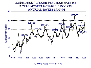 IN BABY TEETH AND EARLY CHILDHOOD CANCER (continued)  Part 2 According to the Connecticut cancer registry, the oldest in the nation, in 1944 there were only 18 children out of 154,000 aged 0 to 4 years diagnosed with cancer, yielding an incidence rate of 11.7 cases per 100,000.