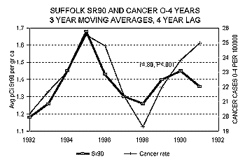 All these peaks are too large to be due to chance. As in our earlier study, there is a significant degree of correlation between a three year moving average of the Sr-90 levels in about 500 Suffolk county teeth and childhood cancer 0-4, but with a somewhat longer lag of 4 years, as in Figure 3.