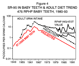 The mean concentration for all 476 teeth is 1.50 pCi Sr-90/g Ca, roughly equivalent to that found in St. Louis children born in 1956, five years after atmospheric testing in Nevada had commenced. The standard error for this average is +/- 0.03. While the mean level for Dade County FL (Miami) teeth is highest (2.80), averages for the entire period 1979-94 from all four areas greatly exceed the level of about 0.2 pCi Sr-90/g Ca. This level would be expected if post-Test Ban Treaty (1964-70) declines observed in St. Louis teeth had continued (Figure 4). Only 135 (28.4%) of the teeth had 0.2 pCi Sr-90/g Ca, while 67 (14.1%) of the sample had readings of 3.0 or higher, about 15 times greater than the projected values. The largest single value was 17.87 pCi Sr-90/g Ca.