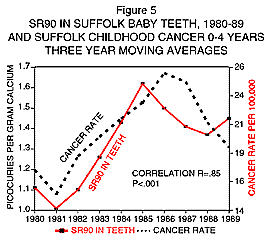 Annual averages in RPHP Sr-90 concentrations are variable, but both averages and peak values rose to their highest levels in 1988, two years after the arrival of Chernobyl fallout. Average measurements rose from 1.48 to 1.51, or 2.2% from 1981-87 (n = 190) to 1988-94 (n=276). Figure 4 displays the RPHP results since 1979, compared to prior measures of Sr-90 in St. Louis baby teeth and in New York City adult dietary uptake. Since both Sr-90 levels in the adult uptake and in the St. Louis baby teeth declined on average by 15.7 percent each year in the years 1964-70, this annual percentage decline is used to project the expected Sr-90 levels in baby teeth from 1970 to 1994. It is clear that the RPHP levels are far higher - in fact about three times higher - than the levels expected based on the assumption that no additional Sr-90 had been introduced into the atmosphere since 1970, a significant difference (p value is infinitesimal). The annual adult dietary uptake in any given year is closely related to the dietary uptake of pregnant women, and thus to the level observed in the baby teeth of children born in that year. Note for example that the adult uptake rose 6 percent (7.8 to 8.3 pCi Sr-90/g Ca) from 1978 to 1979, the year of the Three Mile Island (TMI) accident, and then declined 23 percent, to 5.6 in the following two years when the two TMI reactors were shut down. This accords with the relatively high values found in the RPHP averages in the early 1980s, followed by a rise in 1986 and subsequent decline associated with the arrival and subsequent decay of Chernobyl radiation. Further corroboration is reflected in the observed EPA measures of high radioactivity in milk and water in May and June of 1986. (15) In-depth analysis can be performed on Suffolk County children, who contributed 304 (64%) of the 476 teeth tested to date. A comparison of the mean annual Sr-90 concentrations in teeth with cancer incidence age 0-4 in the county (30) is made in Figure 5.