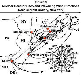 Suffolk was selected because for more than a decade, the county has been the subject of numerous studies in the medical literature, due to consistently high levels of breast cancer incidence and mortality. (20) (21) Rates in the suburban areas of Suffolk and Nassau County (adjacent to the western border of Suffolk) began to exceed even the high rate in New York City beginning in the late 1970s. Moreover, a recent study by RPHP researchers had linked the rise in breast cancer in both Suffolk and Nassau to fission products in the diet and water produced by airborne releases from nearby nuclear plants. (22) Suffolk is the site of the Brookhaven National Laboratory (BNL), a research facility located near the town of Upton in western Suffolk some sixty miles from the eastern end of Long Island. BNL has operated two or three nuclear research reactors at various times since 1951, which have released significant quantities of radioactive elements into the local air, ground and surface waters. As shown in Figure 3, Suffolk is also proximate to several other reactors operating in the 1980s and 1990s. The earliest to begin operation was the Indian Point Plant Unit 1 that started in 1962, followed by the much larger Units 2 and 3 in 1973 and 1976. Located on the Hudson River some 30 miles north of Manhattan, the prevailing winds from the northwest in the winter months move the airborne releases from Indian Point towards western Suffolk, as indicated by the wind distribution measured at BNL shown in Figure 3. Another nuclear plant (Oyster Creek) is located some 60 miles to the southwest on the New Jersey coast near the town of Toms River that began operation in 1969. The prevailing winds in the summer months move from the southwest towards western Long Island, so that the plumes of airborne activity from Oyster Creek cross those from Indian Point in the area of Suffolk just to the west of BNL. Thus the western part of Suffolk receives airborne emissions from three nuclear sites for most of the year, making it the most heavily exposed part of the county. Furthermore, the Oyster Creek plant reported the second highest airborne releases of radionuclides with a physical half life of eight days or more, out of 76 nuclear sites in the nation, with a total of 76.8 curies since 1970. This total far exceeds the 14.2 curies reported for the Three Mile Island Unit 2 during the 1979 accident. (23) It is in this highly exposed area of western Suffolk that 17 out of 18 communities with breast cancer incidence rates above the county average are located, as reported by the New York State Department of Health for the period 1978-87. (22) It is also the area where 19 recent cases of an extremely rare form of childhood cancer (rhabdomyosarcoma) have been identified. (24) Finally, in 11 contiguous five-digit ZIP code areas, which had a 1990 population of 162,187 and was located 10-15 miles northwest of BNL, 79 hospital discharges for cancer in residents age 0-9 occurred in 1997. In comparison, 0 admissions were from easternmost Suffolk, known as the North and South forks (1990 population = 65,416). (25) Two nuclear plants in Connecticut to the north of Suffolk are Haddam Neck near Middletown and Millstone near New London. The three Millstone reactors are only 11 miles north of the northeastern tip of Suffolk County. Although the prevailing winds are directed towards the eastern part of Suffolk only in the winter months, these reactors, like Oyster Creek, have had a substandard record of radioactive emissions, releasing 32.6 curies of long-lived fission products since 1970 - the third highest release among all U.S. nuclear plants. (23) In the winter of 1995-96, the Nuclear Regulatory Commission ordered all three Millstone reactors closed for safety violations. Unit 1 was shut down permanently, while the other two did not operate for 2 ½ and 3 ½ years while extensive physical and management improvements were made. Thyroid cancer, the risk of which is known to be increased after exposure to radioactive iodine found in all reactor emissions, reached significantly high levels in New London (near Millstone) in the late 1980s and early 1990s before the plant was closed. (26) One other nuclear plant along the northeastern Atlantic coast that is less than 100 miles from the Eastern end of Suffolk is the Pilgrim plant 25 miles south of Boston near Plymouth MA. It began operation in 1972 and experienced a series of severe problems, including a major accidental release of radioactive gases in 1982 that was detected all over New England. (27) An abnormally high incidence of leukemia was reported around this plant. (28) Precipitation brings down 90 percent of airborne radioactivity to earth, introducing it into the food chain. (29) Thus the rain and snow in Suffolk recharges the aquifers supplying the drinking water for the wells all over Suffolk county with contamination from radioactive particles released from these facilities. Deciduous teeth, usually shed between the ages of 5 and 12, were selected because they represent a stable calcified tissue similar to bone but in which rates of turnover, exchange, remodeling and accretion are minimal or absent. Thus the deciduous tooth may be considered a stable structure and can thus be taken to reflect the mineral composition acquired at the time of its formation. (5) (6) It can therefore provide information concerning the amount of Sr-90 uptake during the year of the child's birth. A portion of the calcium and Sr-90 is drawn from the mother's bone in addition to the mother's dietary intake during pregnancy, and another portion is derived from the infant's diet in the year after birth for all types of teeth. (5) Thus, for all the purposes of the present study, there is no need to measure incisors, cuspids, and molars separately. Wide variations in Sr-90 occur due to dietary differences and the time of the year when the child is born, (5) so that many teeth are needed to obtain meaningfu